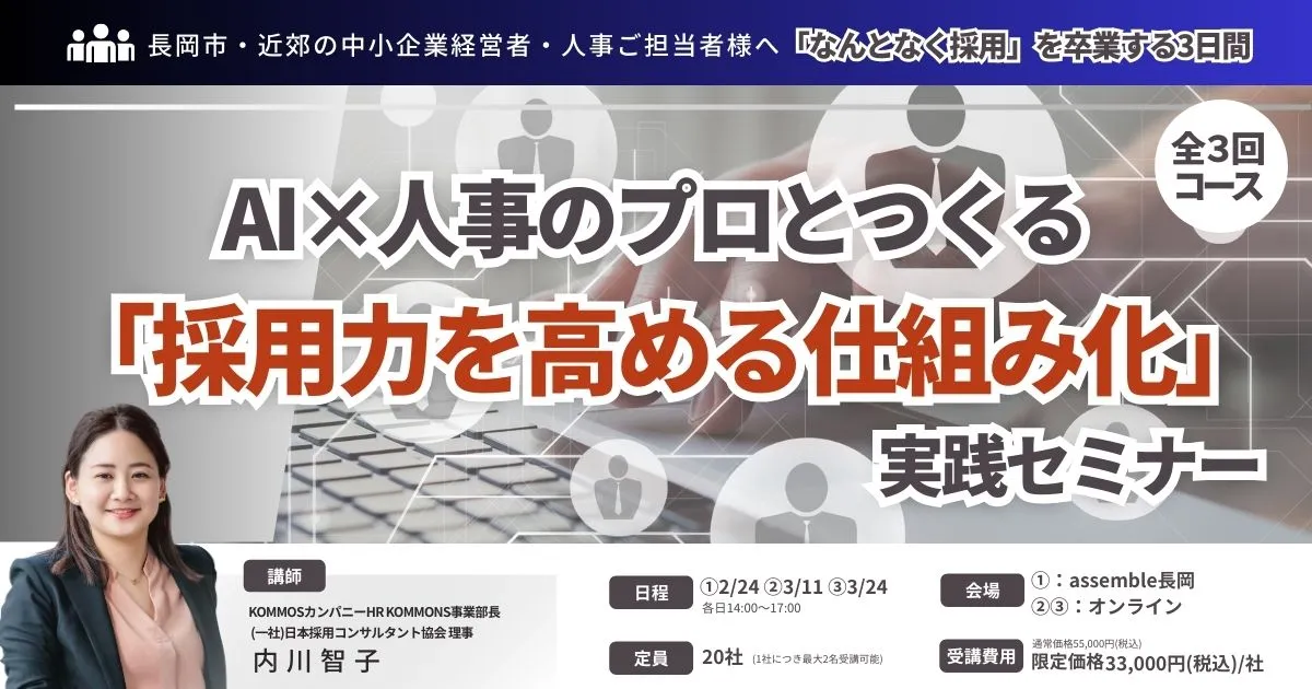 【①2月24日(火) / ②3月11日(水) / ③3月24日(火)・①オフライン開催 ②③オンライン開催】【全3回】AI×人事のプロとつくる 「採用力を高める仕組み化」実践セミナー